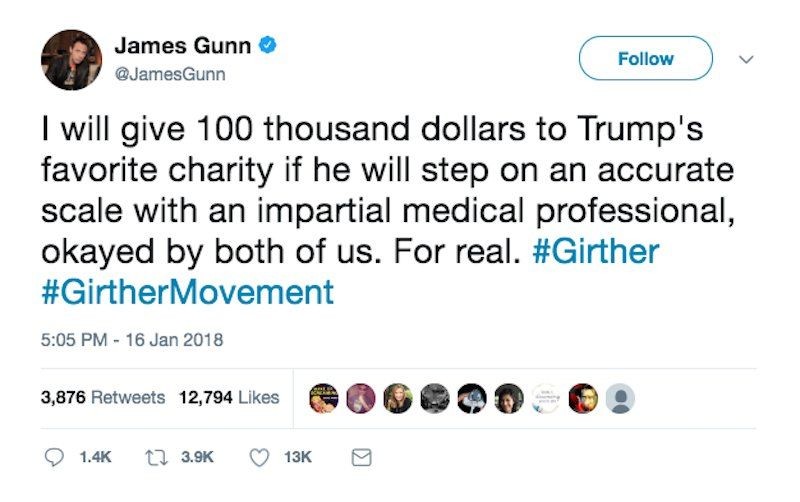 Kampanye #GirtherMovement yang diinisiasi sutradara James Gunn meminta Trump untuk menimbang berat badannya di depan pakar medis profesional. James bersedia menyumbang USD100 ribu jika Trump menyanggupinya. (Foto: twitter/JamesGunn)