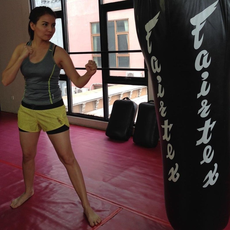 Olahraga yang menjadi favorit Tya saat ini adalah latihan bela diri tatsujin. Olahraga tatsujin merupakan olahraga bela diri campuran dari tinju, kick boxing, muay thai, dan brazilian jiu-jitsu. (Foto: Instagram/tya_ariestya)