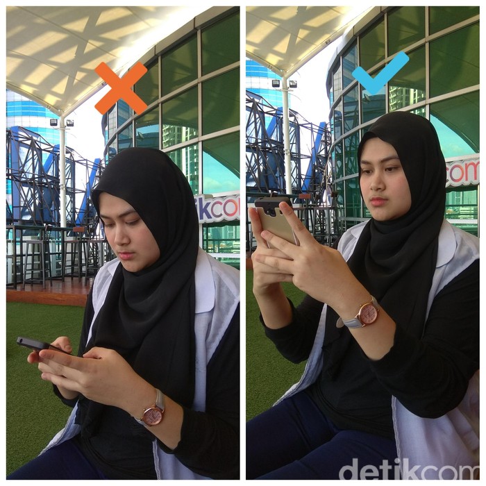 Alihkan pandanganmu dari smartphone selama beberapa menit, jangan biarkan pandanganmu hanya terpaku pada layar handphone. Atur lama penggunaanya agar tetap sehat ya. Foto: Aisyah/detikHealth, Model: Yasmin N. Safira