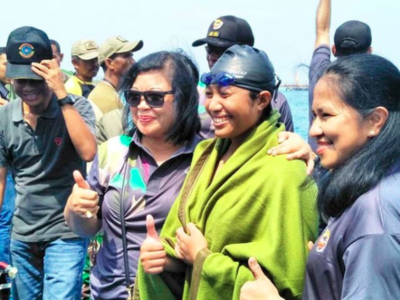 Momen saat Serda Ni Luh Putu Meisaningsih yang akrab disapa Meisa baru saja menyelesaikan lomba renang menyebrangi Selat Sunda. (Foto: Instagram/putumeisaningsih)