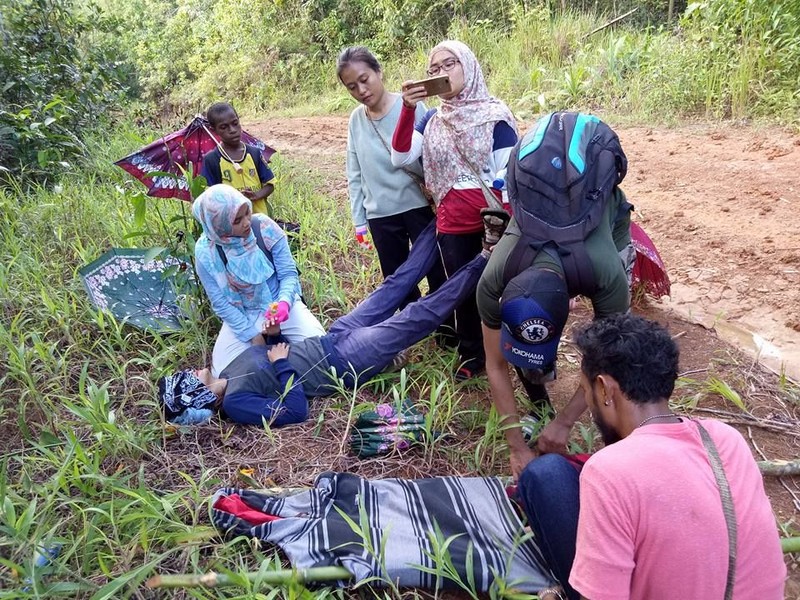 Di tengah jalan sang bidan tiba-tiba saja pingsan. Karena hari mulai gelap akhirnya tim membuat tandu darurat dan melanjutkan perjalanan. (Foto: Facebook/Amalia Usmaianti)