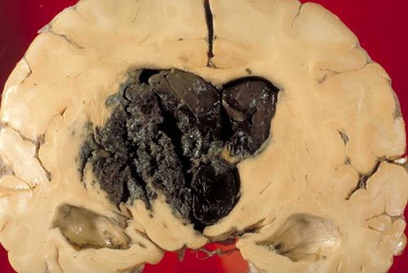 Contoh otak stroke yang terjadi karena ada pembuluh darah pecah di bagian basal ganglia. (Foto: neuropathology-web.org)