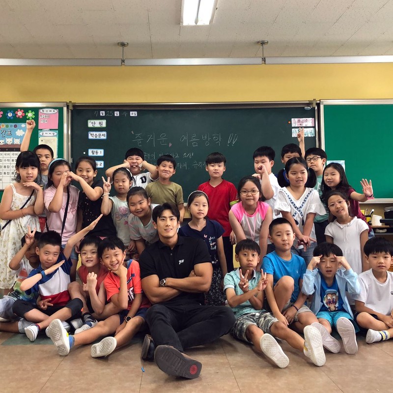 Selain wajahnya yang tampan, Min Gyu tampil mencolok di antara guru lain karena memiliki tubuh kekar. (Foto: Instagram/teacher.lee)