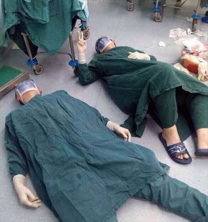 Tim dokter di Fujian Medical University Union Hospital berbaring di lantai kamar operasi. Mereka baru saja sukses menyelesaikan operasi 32 jam pada pasien dengan tumor otak. Foto: Instagram/medschool_life