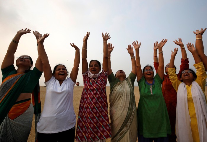 Dikenal juga dengan nama laughter yoga. Diyakini, tertawa yang disengaja dalam sesi yoga ini mampu melepas hormon penangkal stres. (Foto: REUTERS/Amit Dave)