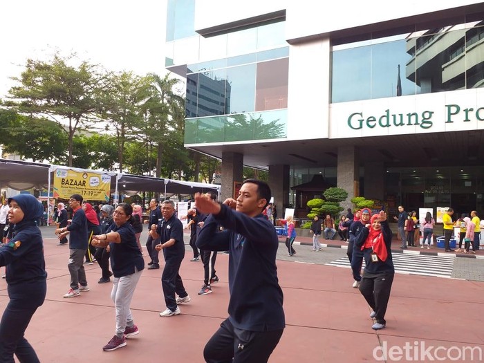 Jakarta - Menteri Kesehatan Nila Moeloek dan survivor kanker ovarium Shahnaz Haque senam bareng di Kementerian Kesehatan Jumat (19/10/2018). Menurutmu siapa paling luwes?