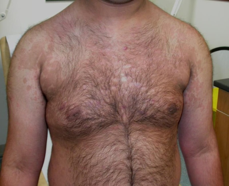 Jamur panu suka menyebar di bagian tubuh atas mulai dari punggung, leher, lengan, dada, hingga ke perut. Foto: Primary Care Dermatology Society/Dermatoweb