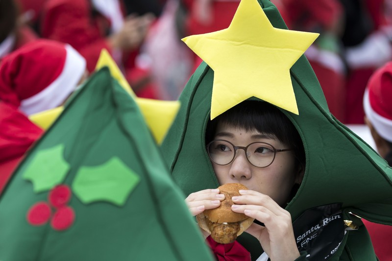 Karena bertema natal, peserta Tokyo Great Santa Run 2018 ini memilih untuk jadi pohon natal. Wah antimainstream nih dia! (Foto: Tomohiro Ohsumi/Getty Images)