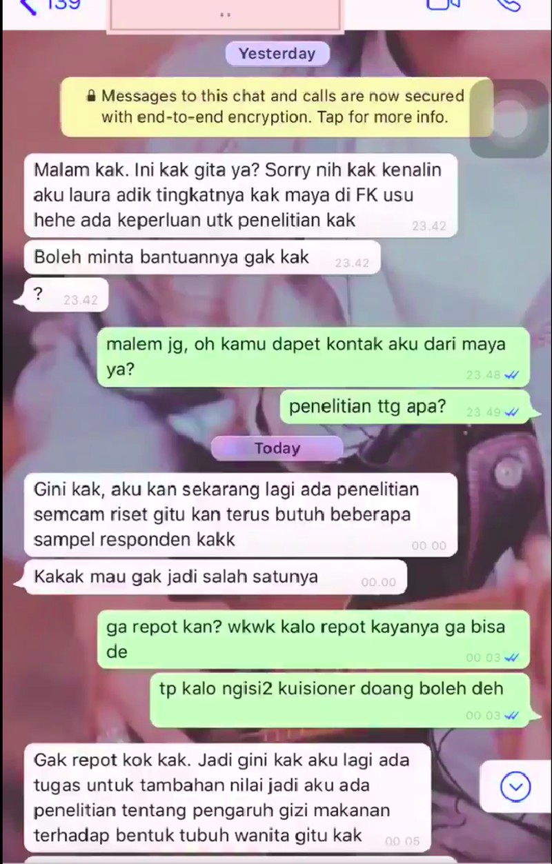 Penipuan berkedok penelitian untuk minta foto naked atau telanjang dari calon korbannya datang lagi. Kali ini, cerita dibagikan oleh Gita (22) melalui akun Twitternya. (Foto: Twitter/@gitaasy)