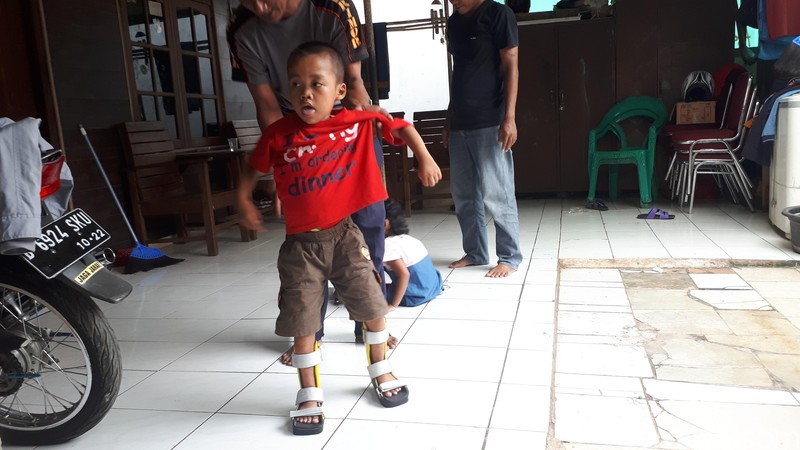 Beberapa anak pengidap celebral palsy, yaitu gangguan gerakan, otot, atau postur yang disebabkan oleh cedera atau perkembangan abnormal di otak, mendapatkan sepatu berwarna yang membantunya untuk berdiri dan berjalan. Foto: Widiya Wiyanti/detikHealth