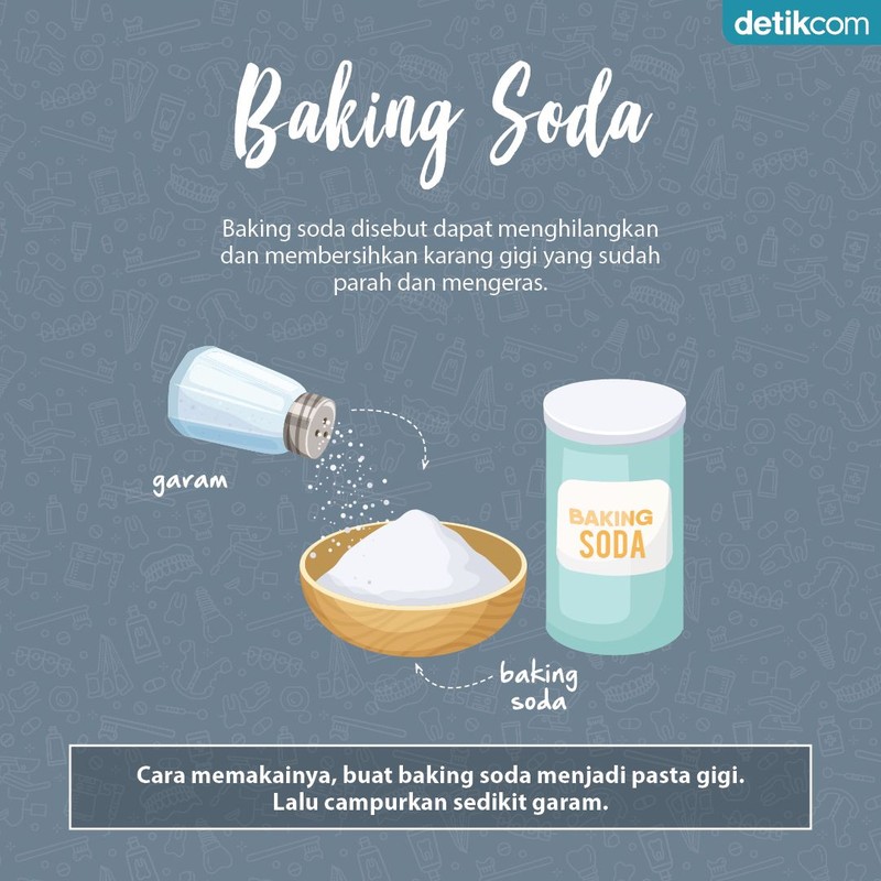 Baking soda disebut dapat menghilangkan dan membersihkan karang gigi yang sudah parah dan mengeras. Cara memakainya, buat baking soda menjadi pasta gigi. Lalu campurkan sedikit garam. Foto: infografis detikHealth