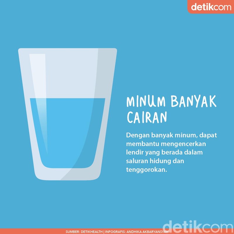 Dengan banyak minum, dapat membantu mengencerkan lendir yang berada dalam saluran hidung dan tenggorokan. Foto: Infografis detikHealth