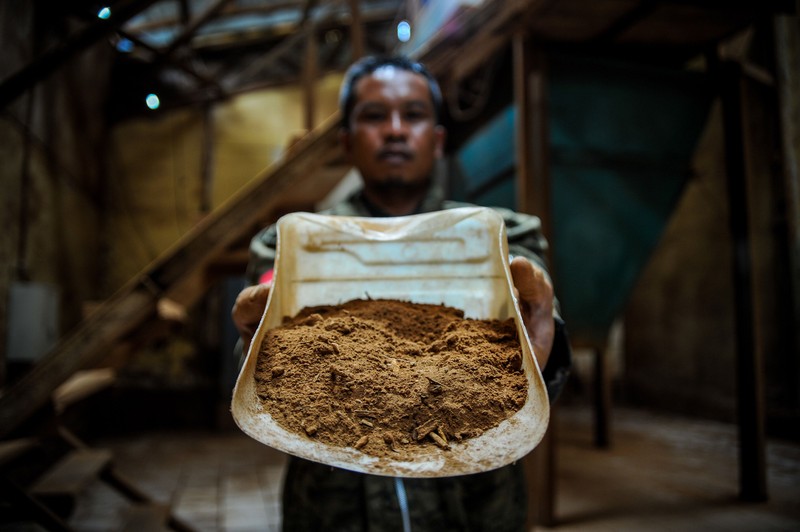 Pekerja menunjukan kulit pohon kina (cinchona) yang telah menjadi kulit kina kering tepung di Pabrik Pengolahan Kina milik PTPN VIII Bukit Unggul, Kabupaten Bandung, Jawa Barat, Kamis (26/3/2020).