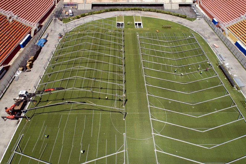 Para pekerja membangun rumah sakit terbuka untuk merawat pasien yang menderita COVID-19 di Stadion Pacaembu, Sao Paulo, Brasil, Senin, 23 Maret 2020. Saat ini total korban positif COVID-19 Brazil mencapai 6.931 pasien. AP Photo/Andre Penner.
