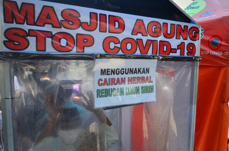 Pengurus masjid setempat memasang bilik disinfektan dengan cairan herbal yang tidak membahayakan bagi tubuh yaitu rebusan daun sirih sebagai upaya untuk mencegah penyebaran COVID-19.