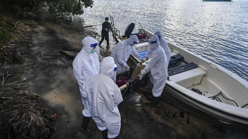 Petugas kesehatan dari EcoNusa Foundation menaikkan warga yang diduga terpapar COVID-19 ke atas kapal saat simulasi penanganan pasien terpapar COVID-19 di Pulau Hatta, Banda, Maluku, Sabtu (14/11/2020).