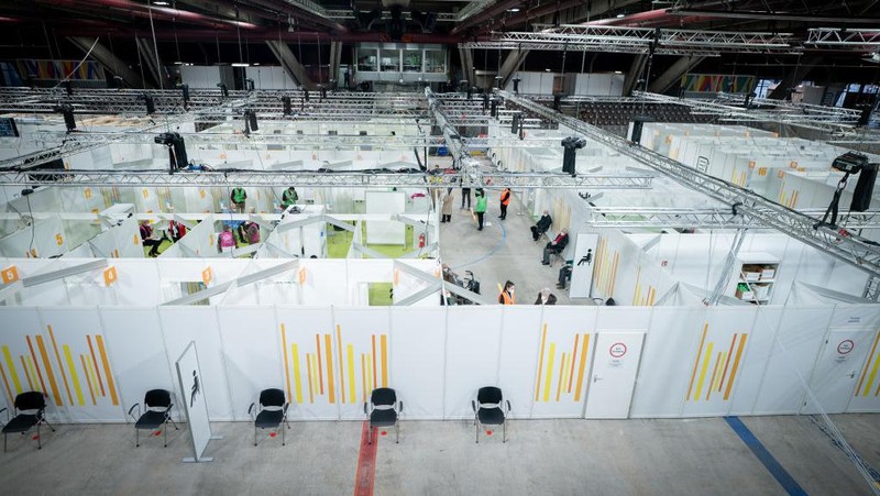 Tak hanya itu, aula festival yang biasanya digunakan untuk konser dan pameran umum pun dijadikan pusat vaksinasi warga Jerman. Boris Roessler - Pool /Getty Images