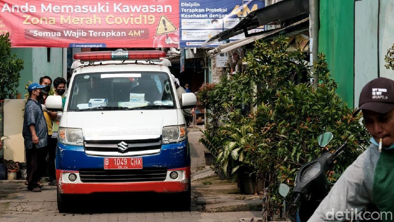 Ambulans milik Dinas Kesehatan Kota Tangerang tiba di lokasi lockdown mikro di Gg Bahagia RW 11, Kelurahan Gerendeng, Kecamatan Karawaci, Tangerang, Banten, Rabu (9/6/2021) menjemput pasien COVID-19.