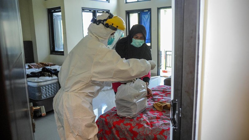 Seorang tenaga kesehatan memberikan obat bagi pasien COVID-19 yang sedang menjalani isolasi di Gedung BLK, Manggahang, Kabupaten Bandung, Jawa Barat, Minggu (13/6/2021).