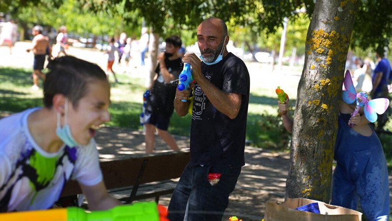 Sejumlah warga Spanyol tampak tak mengenakan masker saat beraktivitas di luar rumah, Minggu (27/6) waktu setempat. AP Photo/Paul White.