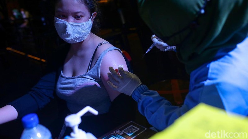 Sejumlah masyarakat tengah mengikuti proses vaksinasi di Bar Holywings, Gunawarman, Jakarta Selatan, Jumat (23/7/2021). Sejak 1 Juli, tempat ini menyiapkan tempatnya untuk dijadikan tempat vaksinasi bagi masyarakat umum hingga 31 Juli mendatang.
