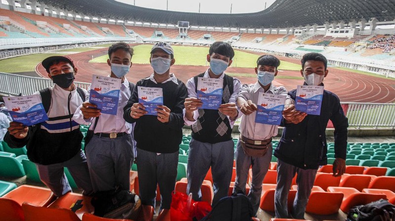 Sejumlah pelajar menunjukan kartu vaksinasi setelah divaksin COVID-19 di Stadion Pakansari ,Cibinong, Kabupaten Bogor, Jawa Barat, Selasa (31/8/2021).