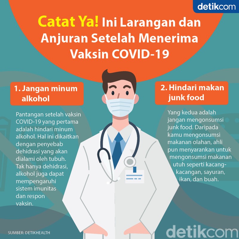 Minum alkohol dan makan junk food termasuk hal yang sebaiknya tidak dilakukan setelah maupun sebelum vaksin COVID-19.