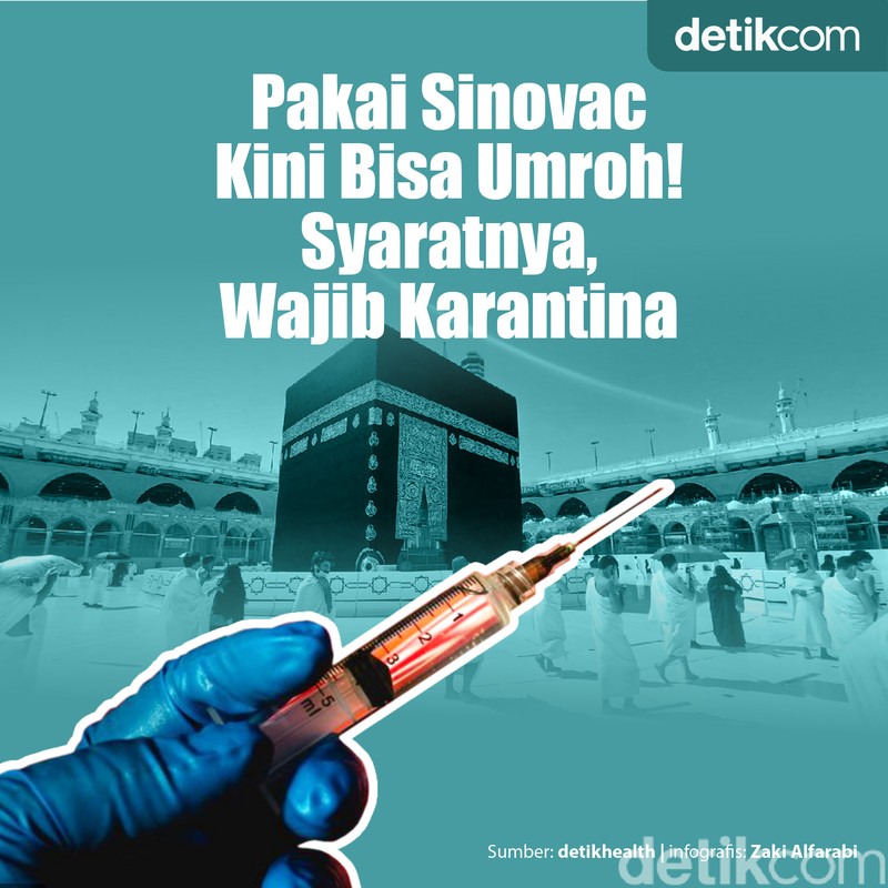 Kata Siapa Pakai Sinovac Tak Bisa Umroh? Ini Kata Menkes BAGIKAN URL telah disalin Penerima vaksin Sinovac sempat was-was karena jenis vaksin ini sempat tidak diterima di Arab Saudi. Menteri Kesehatan RI menyebut, kebijakan terbaru kini sudah memperbolehkan penerima vaksin Sinovac untuk umroh. Syarat tambahan bagi penerima vaksin Sinovac adalah wajib karantina selama 5 hari.