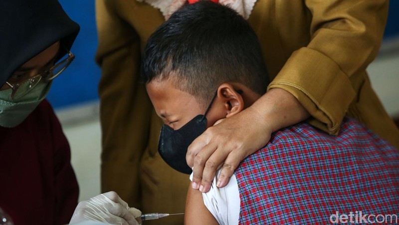 Ekspresi Siswa SD saat Disuntik Vaksin COVID-19 BAGIKAN URL telah disalin Seorang anak meringis saat disuntik vaksin COVID-19. Para murid SDN Larangan 10 Kota Tangerang mengantre saat mengikuti vaksinasi COVID-19, Selasa (4/1/2022). Lebih dari 400 siswa/i SDN 10 Larangan Kota Tangerang mendapatkan vaksinasi dosis pertama hari ini. Vaksinasi ini diperuntukan untuk siswa kelas 1-6 SD. Sebelum divaksin, mereka dicek kesehatannya. Seorang siswa tampak pasrah saat jarum suntik menebus kulitnya. Vaksinasi ini dilakukan atas kerjasama dengan BIN dan TNI.