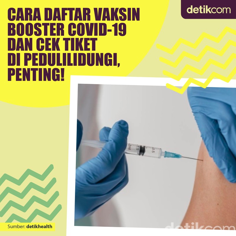 Cek Tiket, Jadwal, dan Lokasi Vaksin Booster di PeduliLindungi? Ini Caranya BAGIKAN URL telah disalin Vaksin booster COVID-19 digratiskan bagi semua warga Indonesia. Prioritas diberikan kepada lansia dan kelompok rentan. Ada 3 kemungkinan regime vaksin booster yang diberikan berdasarkan jenis vaksin yang diterima pada vaksin primer. Untuk cek e-ticket, buka PeduliLindungi melalui web maupun aplikasi.