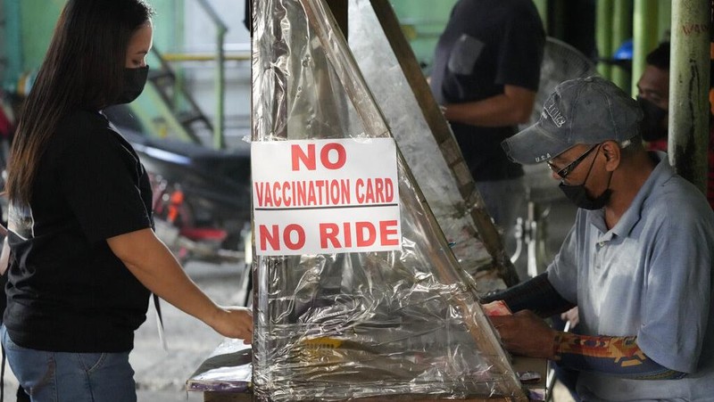Di bawah kebijakan 'no vax, no ride' yang diberlakukan Departemen Transportasi, warga yang tidak sepenuhnya divaksinasi tidak akan diperbolehkan naik angkutan umum seperti jeepney, taksi, bus, kapal feri laut dan pesawat komersial dari dan ke area Metropolitan Manila.