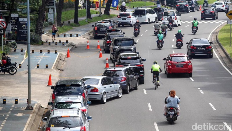 Terlihat seperti kemacetan, antrean panjang kendaraan di kawasan Bintaro ini adalah warga yang tengah mengantre untuk menjalani tes PCR.