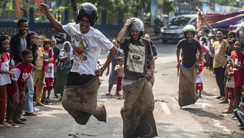 Lomba balap karung juga telah mengalami modifikasi, dari yang tadinya hanya berdiri sekarang sampai jongkok dan pakai helm, seperti mau balap motor saja. Gimana kamu ikut lomba apa 17-an kali ini detikers? ANTARA FOTO/Aloysius Jarot Nugroho