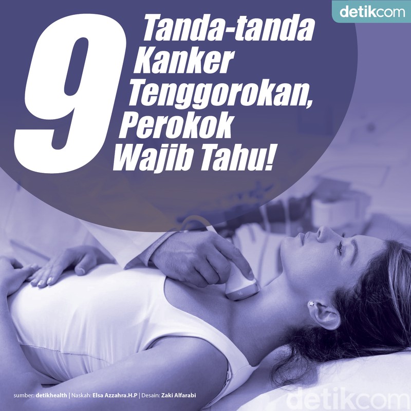 9 Tanda Kanker Tenggorokan, Perokok Wajib Tahu BAGIKAN URL telah disalin Kanker tenggorokan dapat dipicu oleh banyak faktor, salah satunya merokok. Foto: Infografis detikHealth Sebelum membahas gejalanya, kenali dulu jenis-jenis dan penyebab kanker tenggorokan. Foto: Infografis detikHealth Ada banyak gejala yang bisa dikenali. Salah satunya berat badan turun drastis tanpa penyebab yang pasti. Foto: Infografis detikHealth