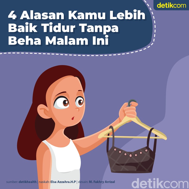 Tidur Malam Tanpa Bra, Payudara Lebih Sehat? Ini Faktanya BAGIKAN URL telah disalin Pertimbangan utama tidur mengenakan bra atau tidak umumnya lebih didasari faktor kenyamanan. Kalau memang nyaman, kenapa tidak? Kalaupun ada yang menganggapnya lebih sehat, memang ada benarnya.