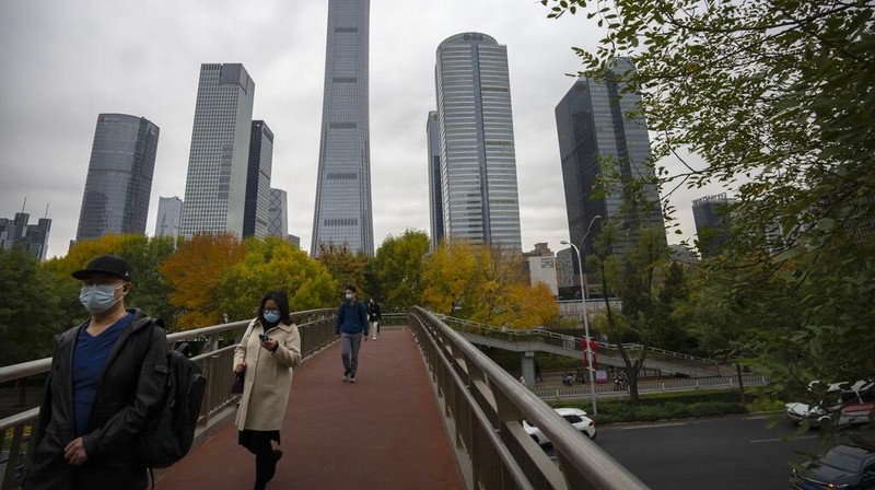 Orang-orang mengenakan masker berjalan melintasi jembatan penyeberangan di kawasan pusat bisnis di Beijing, Jumat, (28/10/2022). AP/Mark Schiefelbein