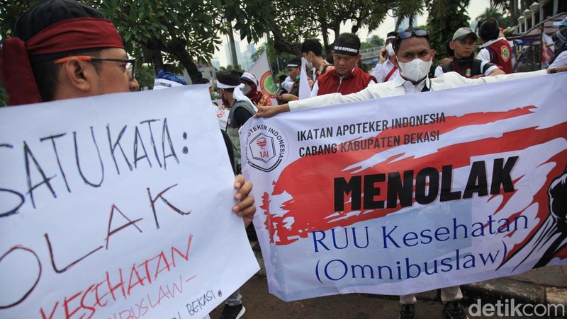 Ratusan Nakes Geruduk Gedung DPR BAGIKAN URL telah disalin Ratusan tenaga kesehatan dari berbagai ikatan profesi berunjuk rasa di depan Gedung DPR, Jakarta, Senin (28/11/2022). Mereka menolak Omnibus Law dalam bidang kesehatan. Beberapa organisasi profesi terlibat dalam unjuk rasa ini seperti dokter, bidan dan apoteker. Hingga pukul 10.16 WIB, aksi masih berlangsung. Massa membawa sejumlah spanduk dan poster tuntutan, meneriakkan yel-yel, berorasi dan membawa bendera organisasi masing-masing. Aksi ini berlangsung tertib. Perwakilan demonstran berorasi. Massa tampak mematuhi protokol kesehatan saat beraksi.
