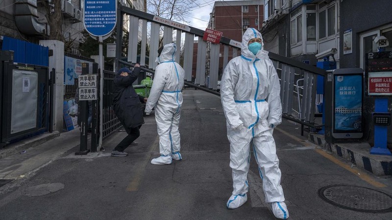 Petugas dengan APD berjaga di depan pemukiman yang dilockdown di Beijing, China, 29 November 2022.