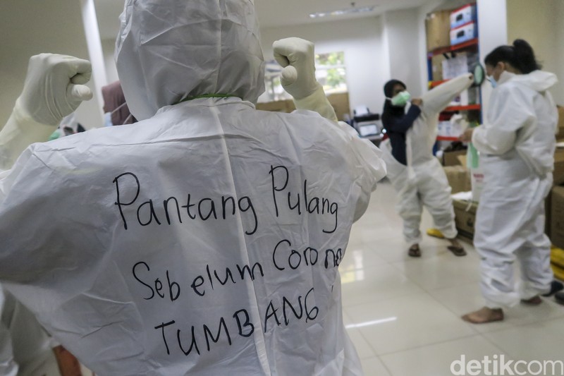 Banyak tenaga kesehatan yang ditugaskan atau menjadi relawan untuk menangani para pasien COVID-19. Mereka rela untuk tidak pulang dalam waktu yang cukup lama sejak melonjaknya kasus COVID-19 di Indonesia pada 2020 lalu demi menjalankan tugasnya itu. (Foto: ANTARA FOTO/M RISYAL HIDAYAT)