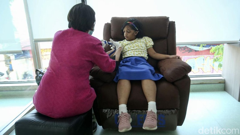 Seorang anak sedang diambil darahnya saat mengikuti program Batik Pelangi di Gedung Genomic Hub, Jakarta, Rabu (17/5/2023).
