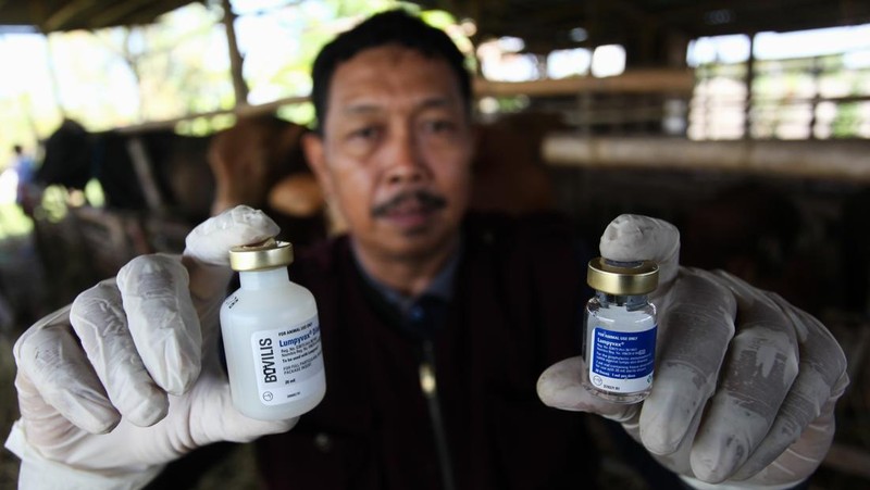 Petugas Dinas Ketahanan Pangan dan Pertanian (DKPP) Kota Surabaya menunjukkan vaksin LSD sebelum disuntikkan kepada hewan ternak sapi di Surabaya, Jawa Timur, Rabu (7/6/2023).