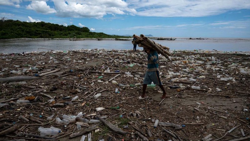Seorang pria mengumpulkan bambu di antara sampah, termasuk sampah plastik dan limbah rumah sakit, di Pantai Paparo di Negara Bagian Miranda, Venezuela, pada 6 Juni 2023.