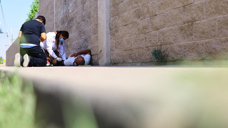 Paramedis merawat seseorang di siang hari dengan suhu tinggi, di Ciudad Juarez, Meksiko. Keadaan darurat di Meksiko terjadi di antara 12 hingga 25 Juni 2023, 104 orang meninggal dunia, berdasarkan data Kementerian Kesehatan setempat yang dirilis Rabu (28/6/2023).