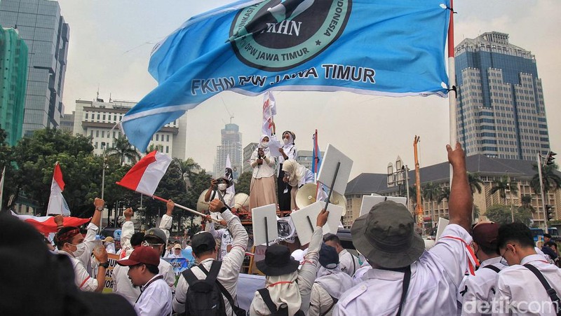 Ratusan Tenaga kesehatan (nakes) hingga sopir ambulans berunjuk rasa di Patung Kuda, Jakarta, Senin (7/8/2023).