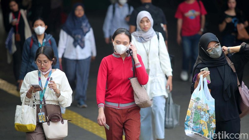 Sejumlah pekerja menggunakan masker di kawasan Sudirman, Jakarta, Selasa (22/8/2023).