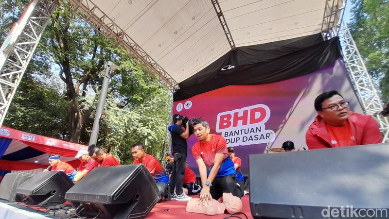 Selain acara jalan sehat, Indonesia Heart Walk 2023 juga diisi dengan sosialisasi Bantuan Hidup Dasar (BHD) pada masyarakat. Hali ini dilakukan untuk memberikan edukasi terkait pertolongan pertama darurat untuk mencegah kematian pada pasien henti jantung. Foto: DetikHealth/Averus Al Kautsar