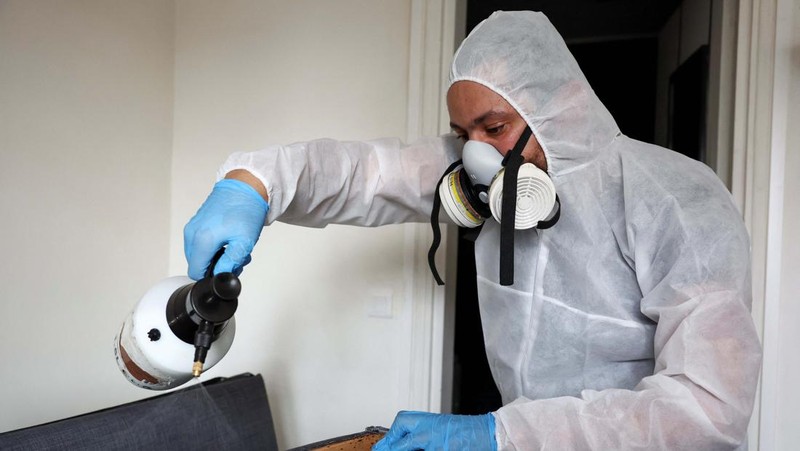 Salim Dahou, teknisi biosida di perusahaan Hygiene Premium, menyemprotkan insektisida terhadap kutu busuk di tempat tidur sofa di L'Hay-les-Roses, dekat Paris, Prancis, 29 September 2023.