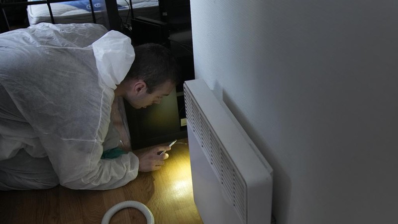 Petugas pengendalian hama, Lucas Pradalier mencari kutu busuk di sebuah apartemen di Paris, Rabu (4/10/2023).