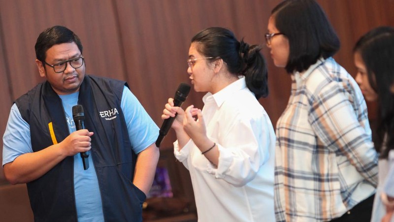 Corporate Relations and CSR Manager Erha Clinic Oemar Saputra (kiri) mendengar kesaksian penyintas penyakit Psoriasis di Surabaya, Jawa Timur, Minggu (26/11/2023).