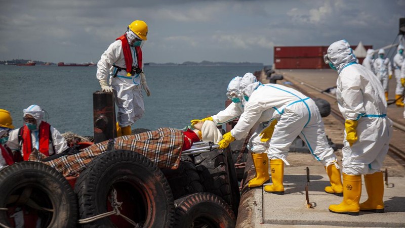 Simulasi dilakukan petugas dari Kantor Kesehatan Pelabuhan (KKP) Kelas I Batam bekerja sama dengan Satuan Brimob Polda Kepri.